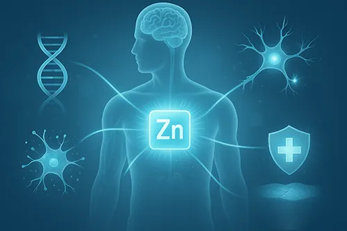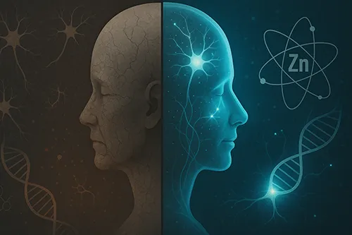 Когда мы слышим “цинк”, часто думаем про иммунитет, заживление ран, кожу. [1] Но этот микроэлемент — один из «невидимых помощников» нашего организма, который влияет и на мозг, и на старение. Хотя в теле его содержится совсем немного (пару граммов), его роль огромна: от работы сотен ферментов до регуляции синапсов и защиты нейронов от старения.